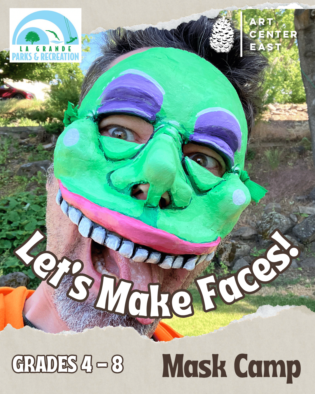 Let’s Make Faces: Mask-Making with Papier-Mâché Clay (Grades 4-8) August 11, 12, & 13 from 10:00 am - 12:00 pm Get ready to get messy and creative in Let’s Make Faces: Mask-Making with Papier-Mâché Clay! Art Center East and La Grande Parks and Recreation are partnering for this exciting, hands-on summer camp where students build